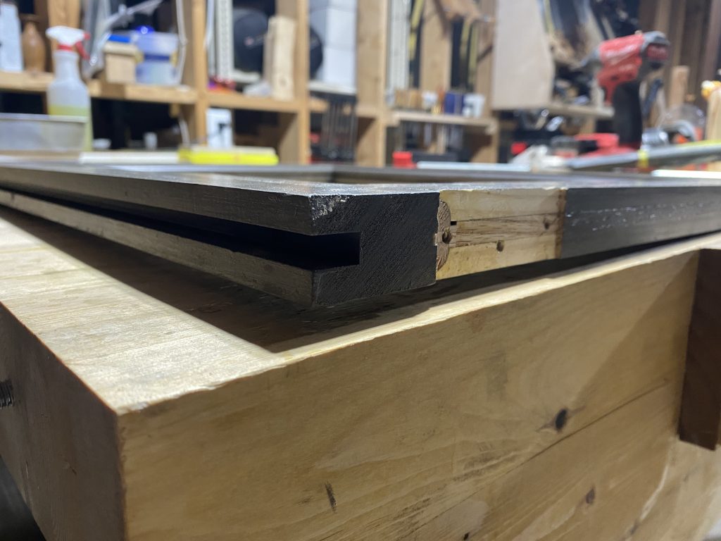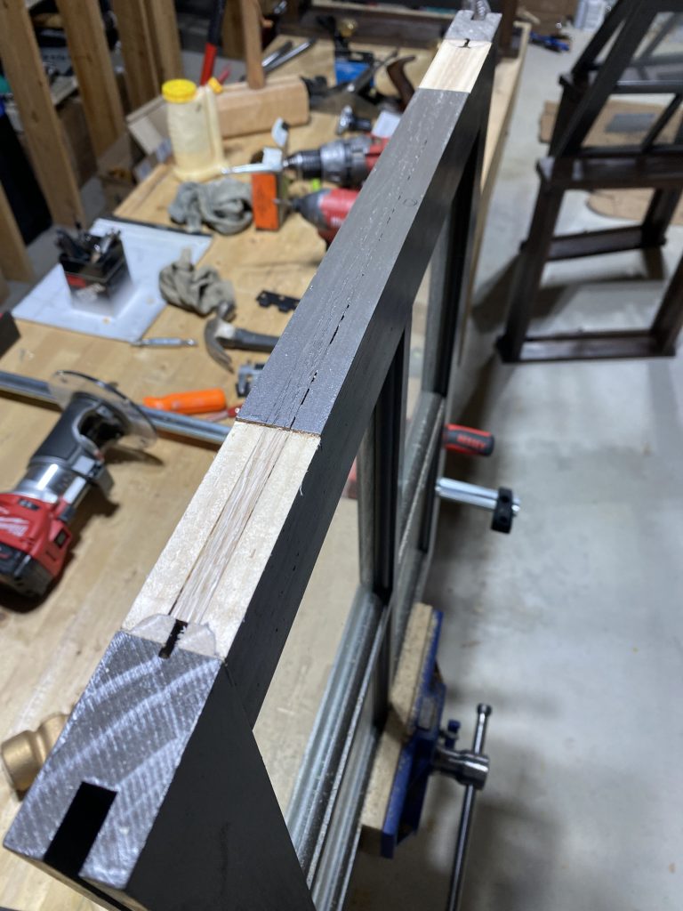 While the window panels themselves were sold as “sash” windows – they weren’t exactly what I would consider a true sash window. They had some oddities about them likely derived from the fact that they were sold with a feature to “easily replace the window panes”. Basically this means that the sides of the frames were attached to the top and bottom with a few screws and the whole window could be disassembled. While a novel idea – using a few screws to hold together an entire frame in soft wood isn’t totally ideal. To top it off, the screws were embedded in slots along the sides of the frames but for some reason they also had the same slot on the top – exactly where I wanted to attach hinges. My fix for this was to glue in a piece of scrap oak I had laying around…
