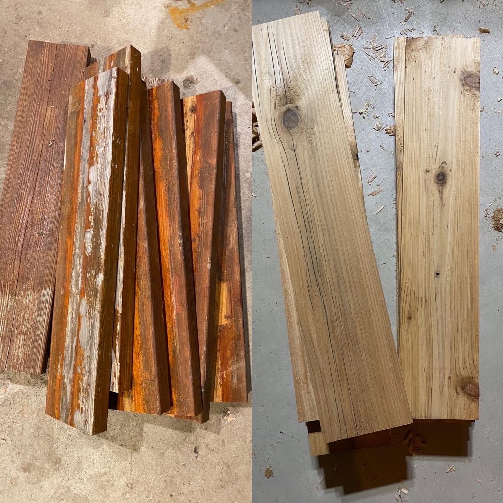 I had recovered some wood from an outside wood pile at the farm that the previous owner had left. A lot of the wood had unfortunately already rotted away but I found a number of cedar boards that looked like they could be saved. Although many of them had fairly severe cupping, in the end, I was able to save a large portion of them. Here are some before and after pictures…